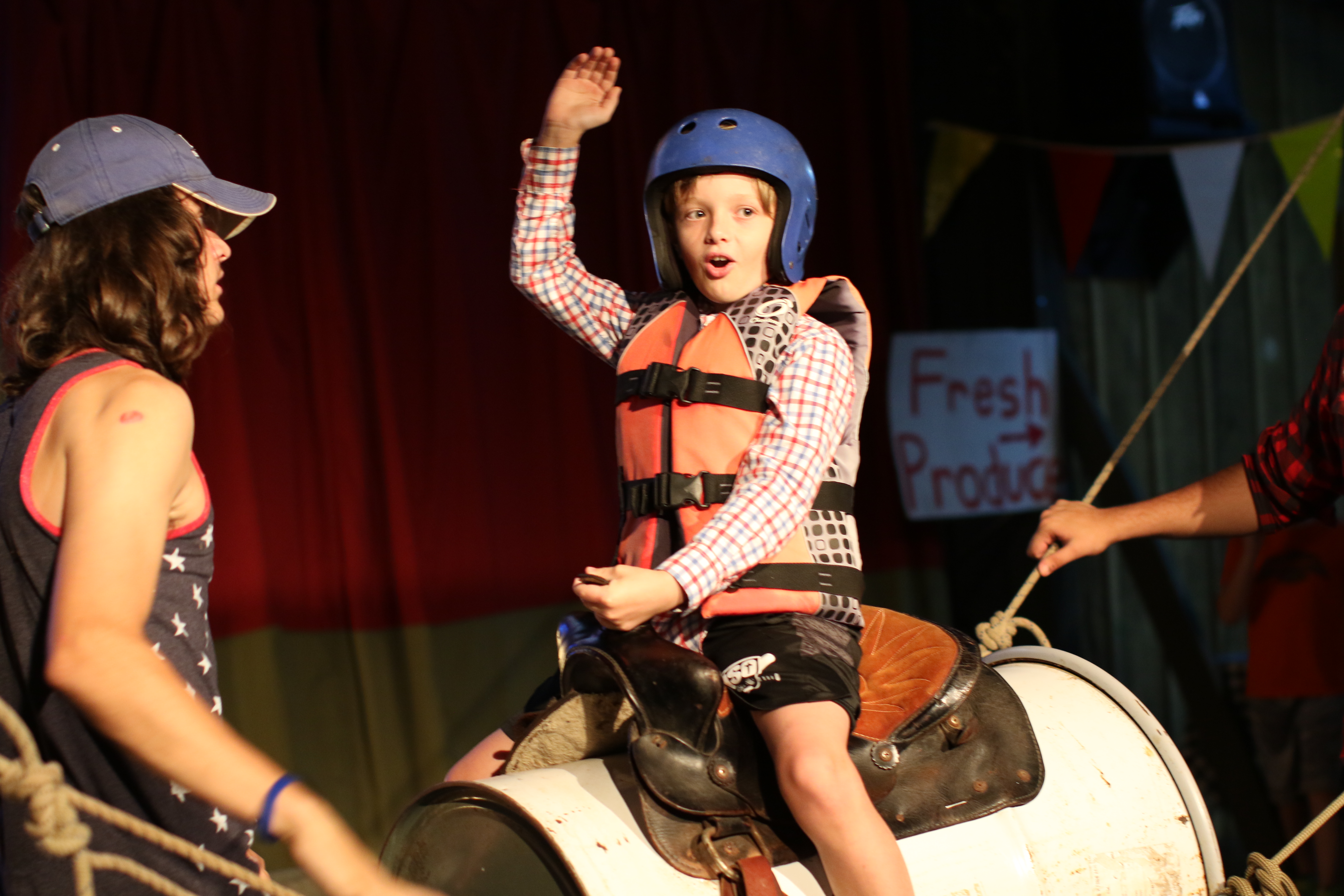 As the gym doors flew open to welcome all the campers and staff, we were overwhelmed with the sweet smells of cotton candy, freshly popped pocorn, fried oreos and jambalaya. With tickets in hand, every camper raced in to enjoy the fun games andsome tasty treats. There was a tractor pull, a shooting range, a movie theater, a fruit stand, quilt making, bull riding, calf roping, ring toss and more.