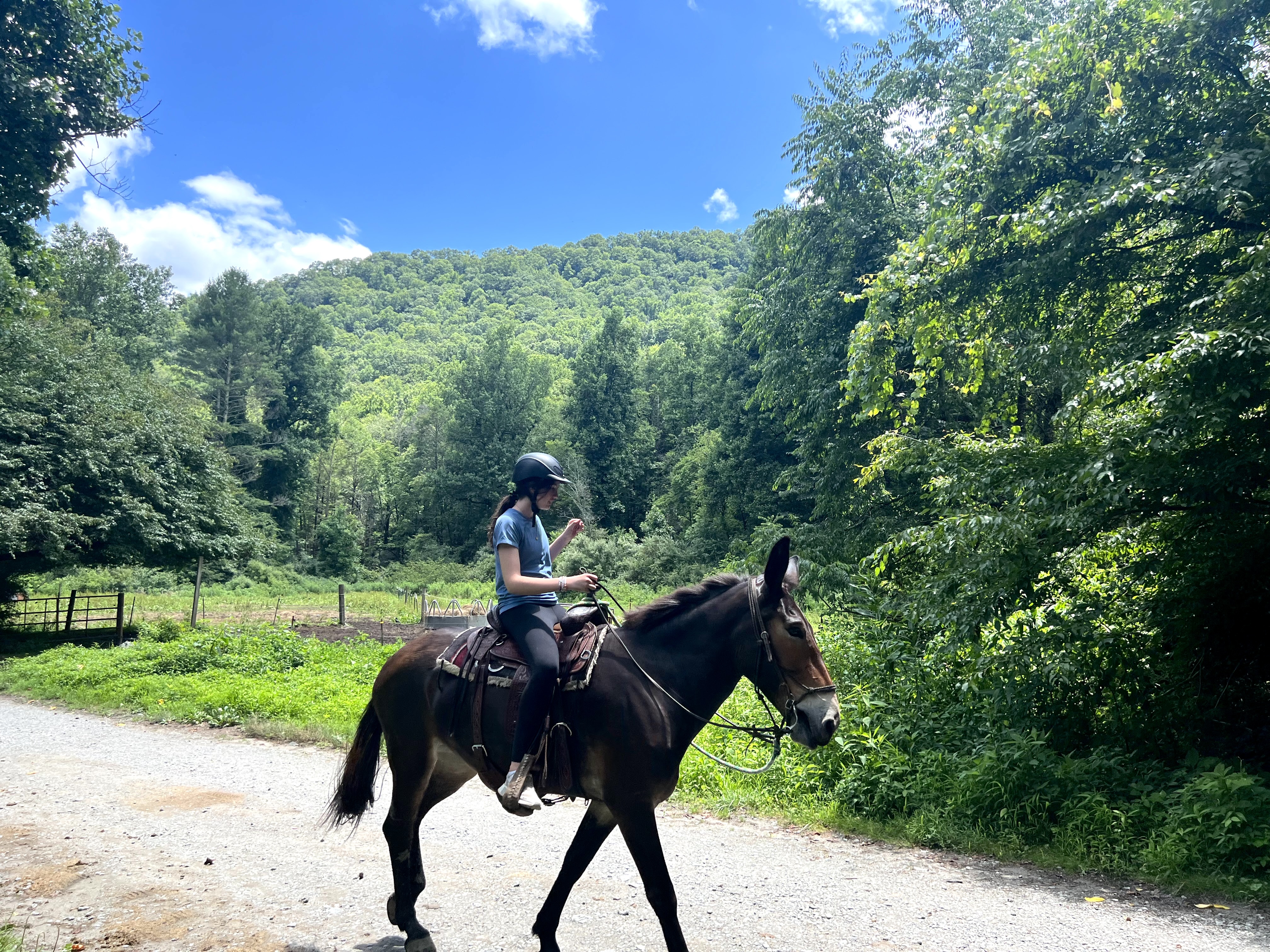 We have Camper Choice Trail Rides (ages 9-16) on camper choice days for a one-hour trail ride in our beautiful and beloved Pisgah Forest, mounted on well-trained horses, that are professionally guided, for a morning of fun and adventure!